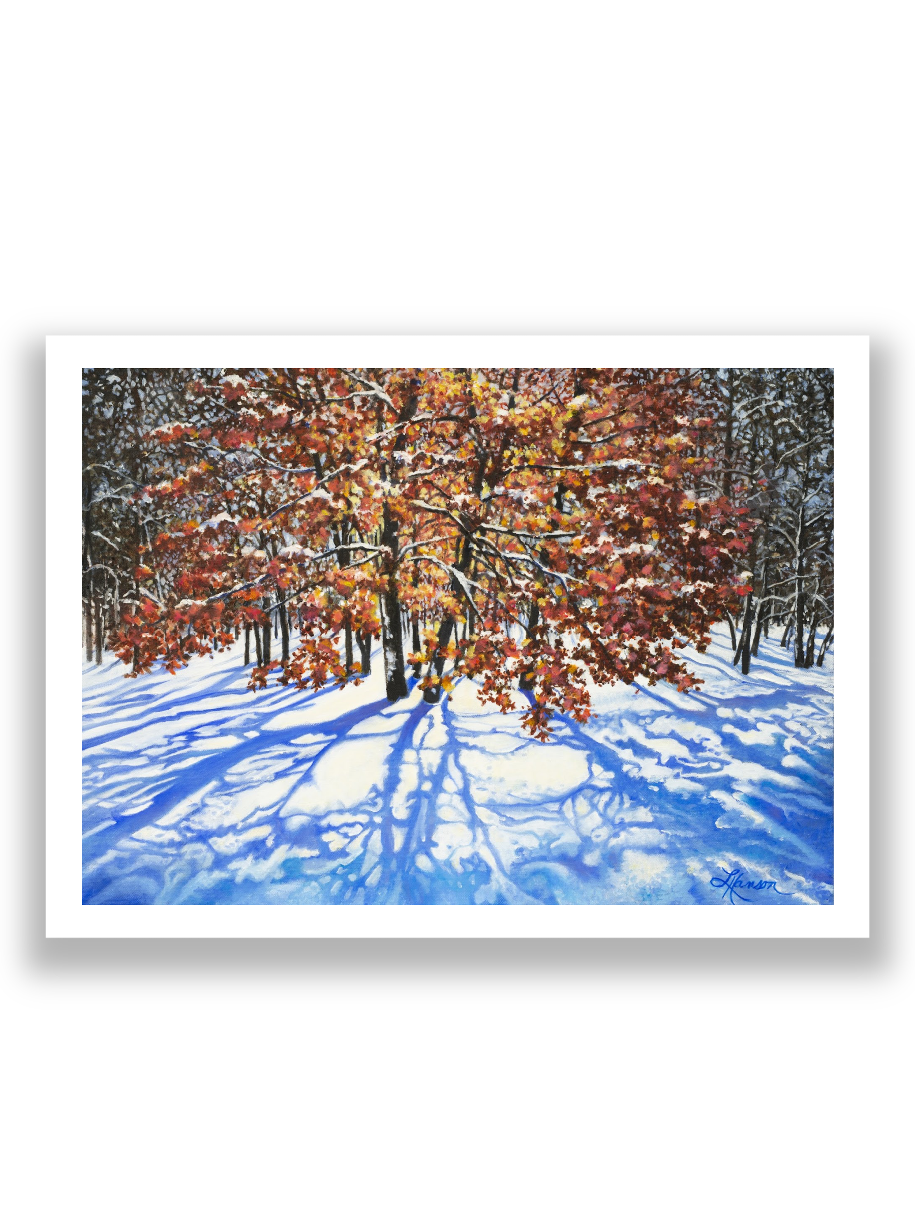 On a cold winters day the warmth of the sun is welcome! The oak tree that is still hanging on to it's leaves from the past fall, seems to be dancing in the spot light of the sunshine. Keeping a rhythm, rattling its leaves to the time of the breeze. I intensified the feeling of dancing with the contrasting warm and cool colors of the leaves against the blues of the shadows, with a busy rhythmic lines and detailed pattern of shadows and leaves