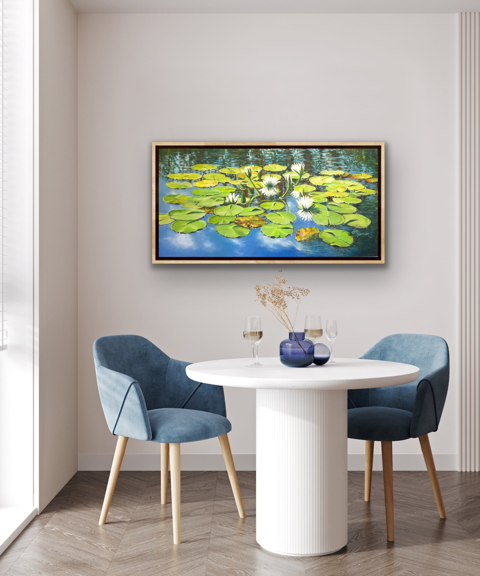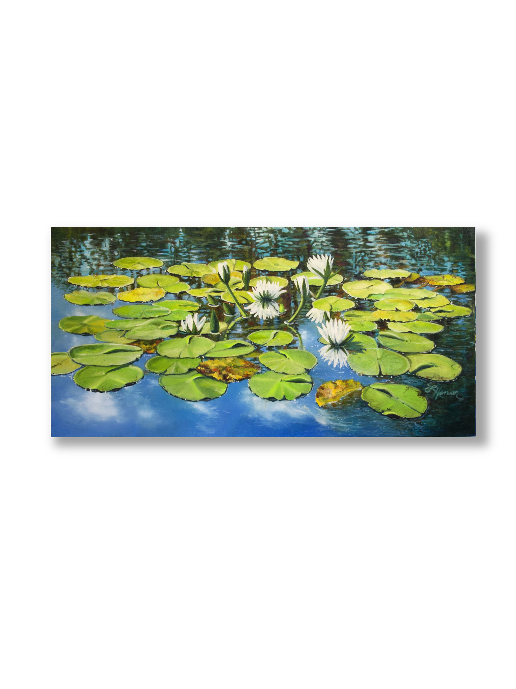 The flat surface of the water pond acts as both a mirror reflecting the blue sky and clouds as well as supporting the Lilies. Vibrant colors of oils were layered to emphasize the reflective quality of the pond as well as the lily pads.