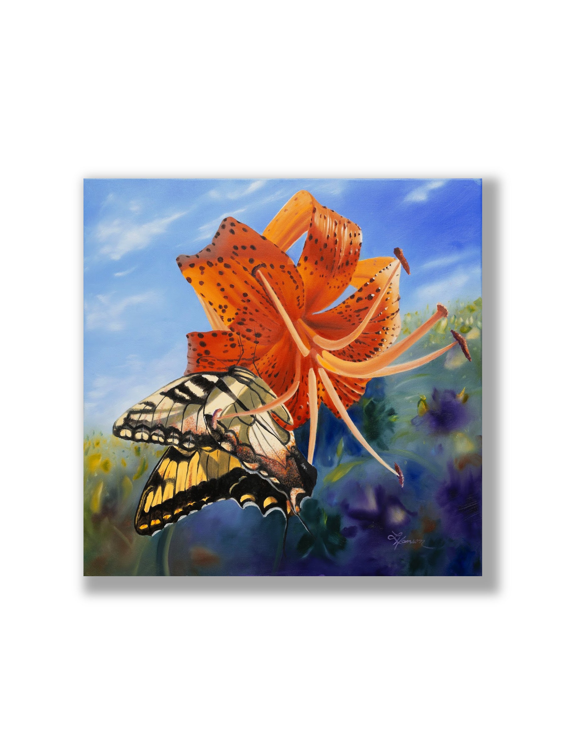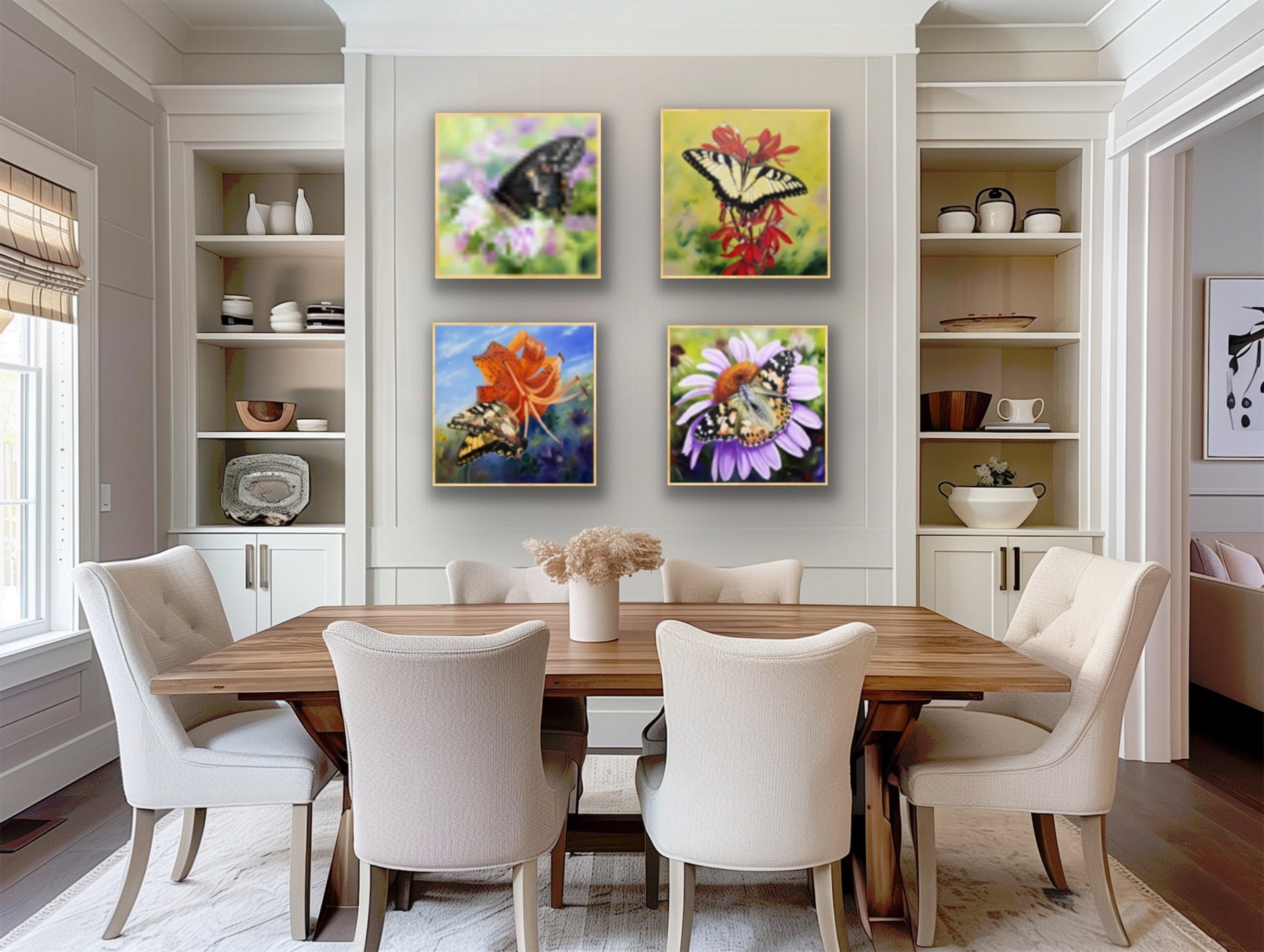 I love butterflies! They remind me of fling flowers. I painted a collection of 5 butterflies and flowers from my photos. Some paintings are referenced from separate photos of a butterflies and different flowers, then, composed together on canvas.