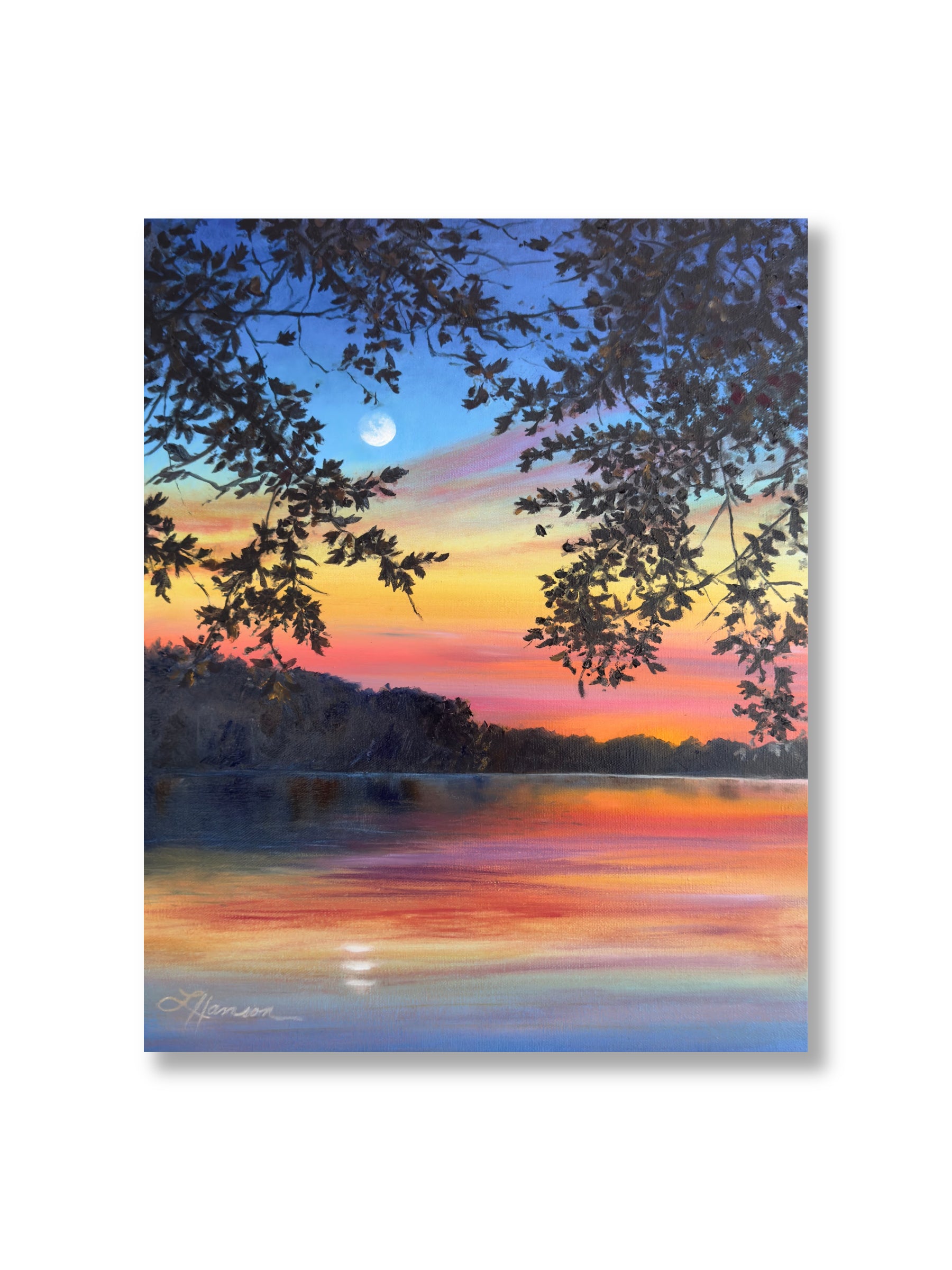 That time just before sunrise and after the sun shows itself above the horizon is called the blue hour. Witnessing a moon rise and a colorful sky from the sun set on the lake is truly magical!