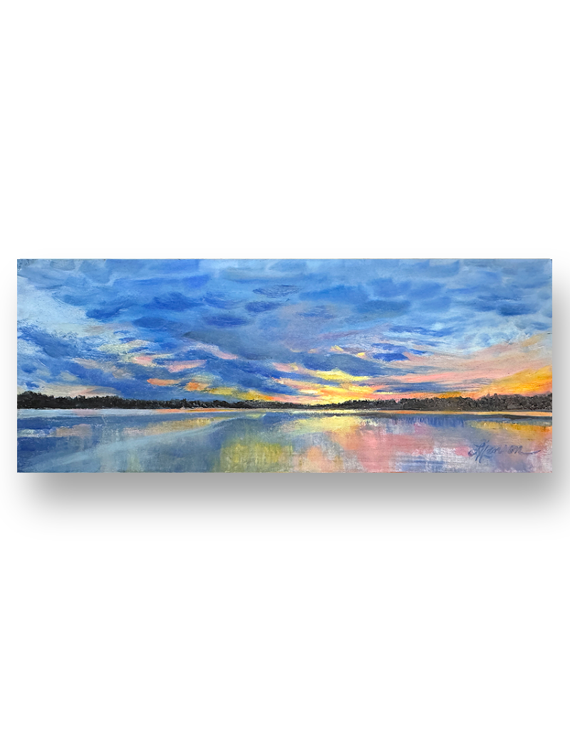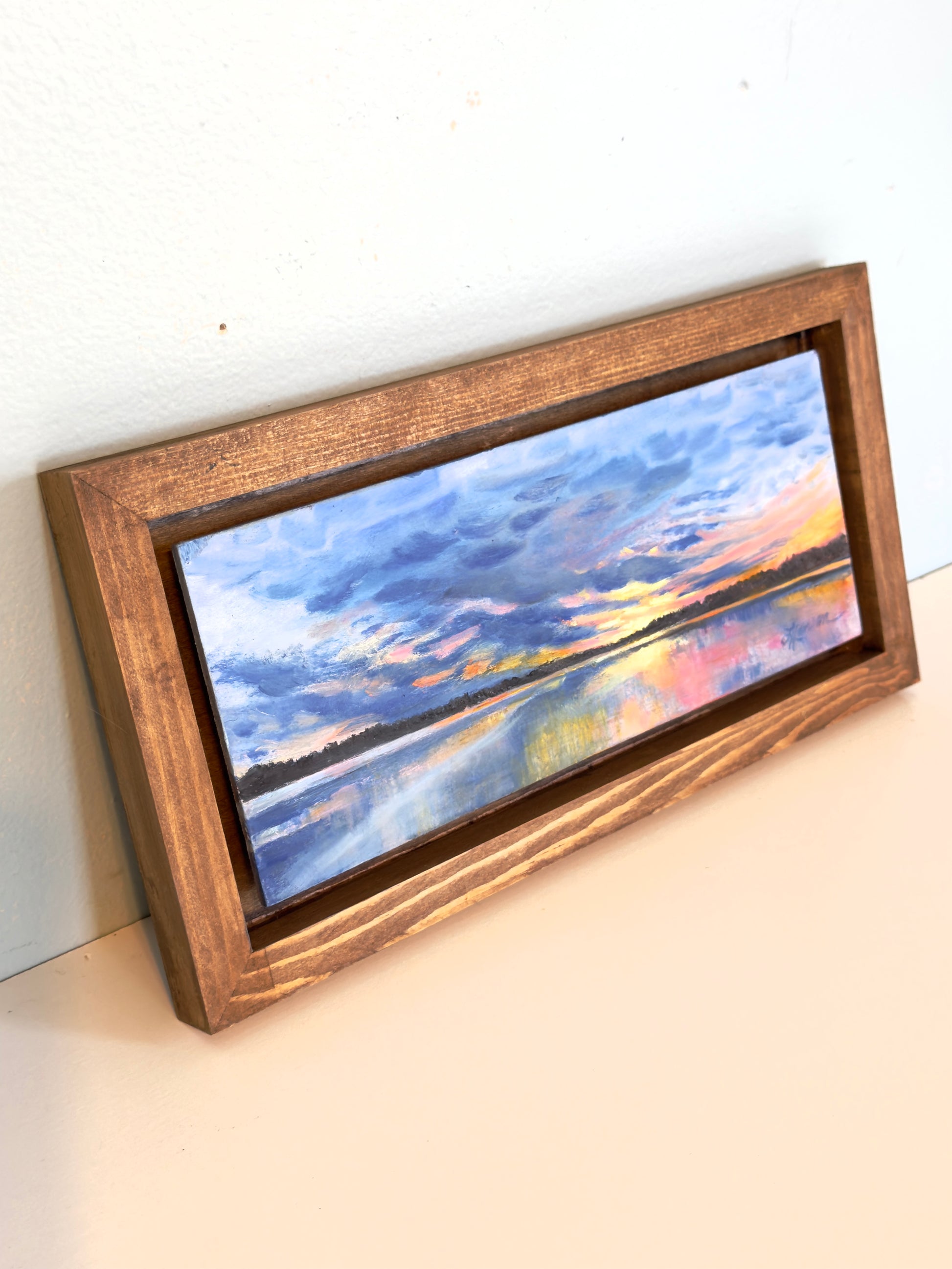 4" x 10" oil on panel w 6" x 12" natural honey oak stained wood floater frame.