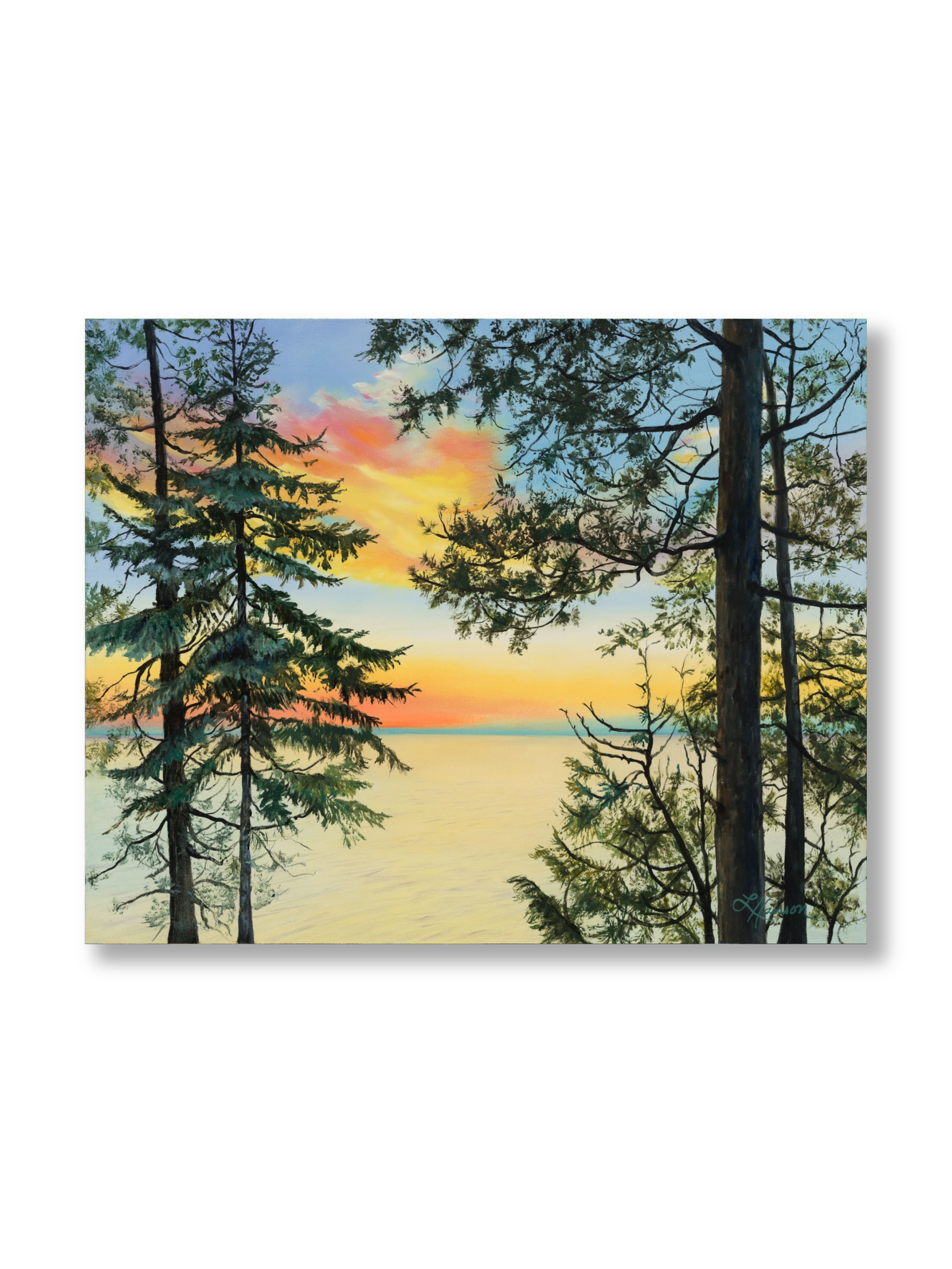 Inspired by my experience camping on Lake Superior, this work captures the radiant sky just after sunset pine-framed lake view from the shore at dusk, highlighting the subtle interplay of glow of light cast over everything that defines this serene evening. The painting invites viewers to experience the quiet beauty of a lakeside evening in nature.