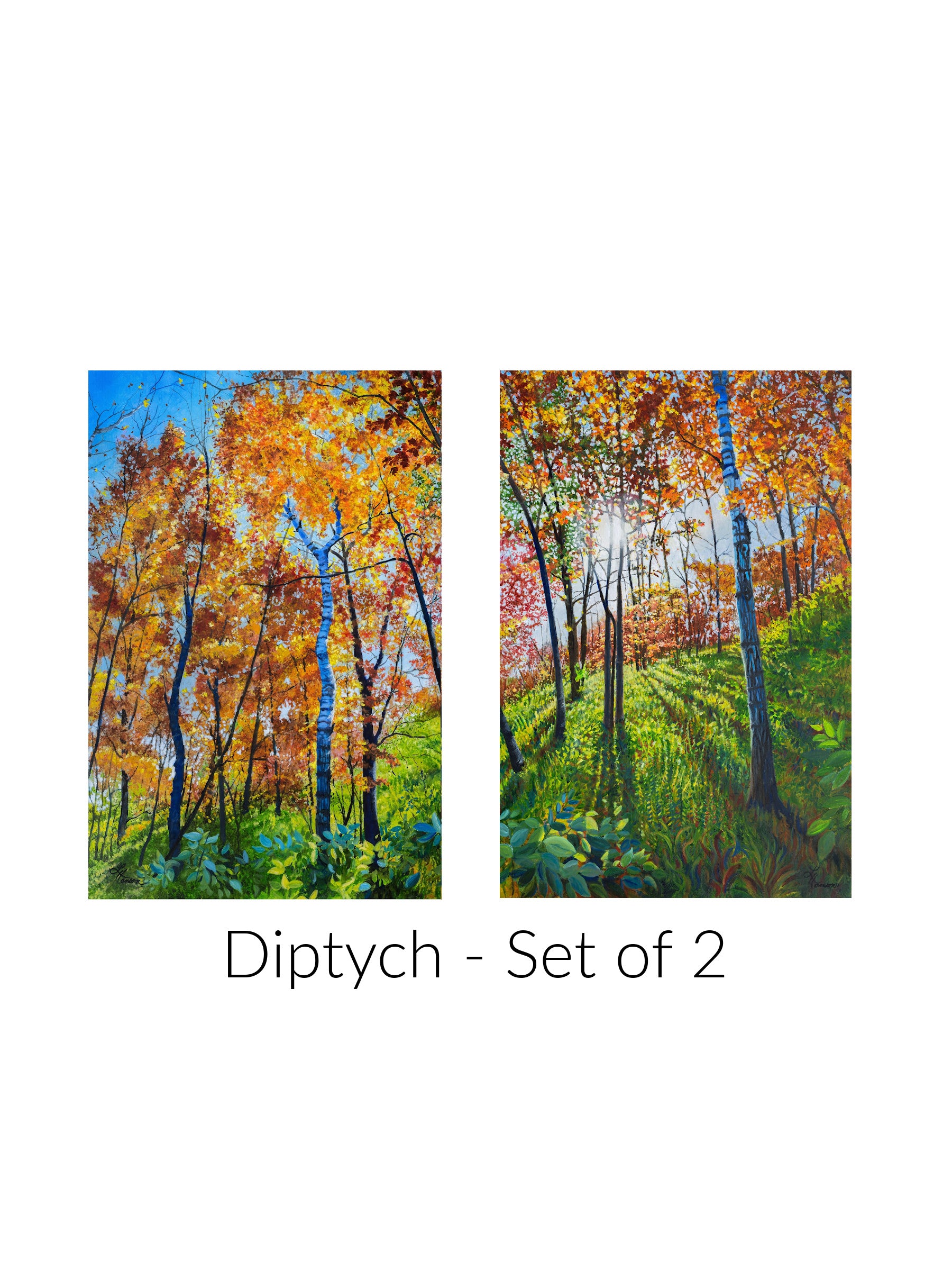 Beautiful colors of fall along the wooded hillside. The sun shining through the leaves down the hill with long shadows as if it is calling you upwards. This is a 2 piece set diptych.