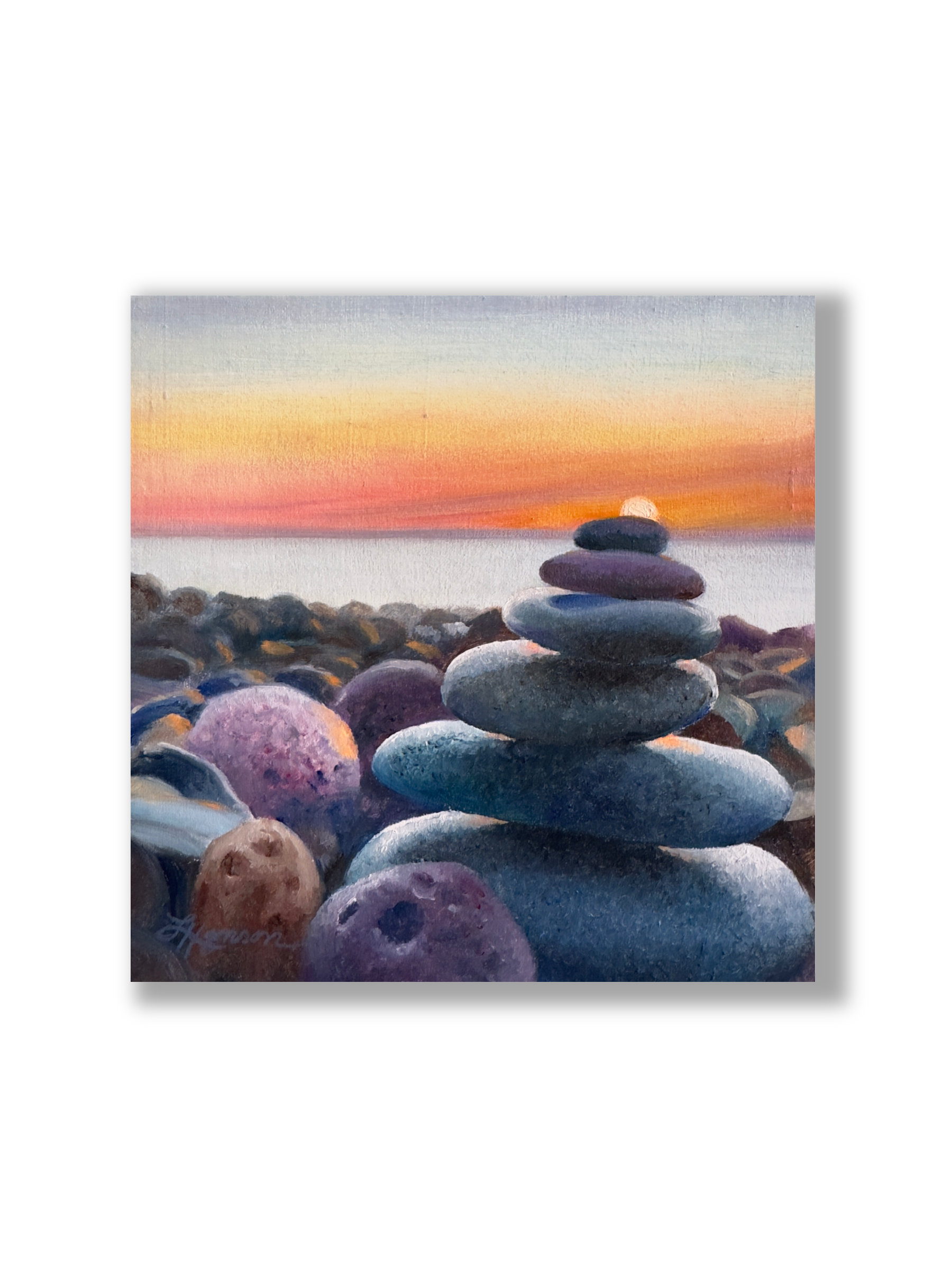 Stillness and balance. This piece focuses on a carefully stacked tower of north shore stones I stacked while watching the sun gently fade over the horizon. Creating this work was deeply meditative, inspired by the quiet rhythm of arranging stones combined with the calm presence of watching the sun set. Through subtle shifts in blues, grays, and purples in the stones, alongside the soft glow of the horizon, I aimed to capture a moment of peaceful transition—an invitation to pause, breathe, and find harmony within nature’s quiet rhythms.