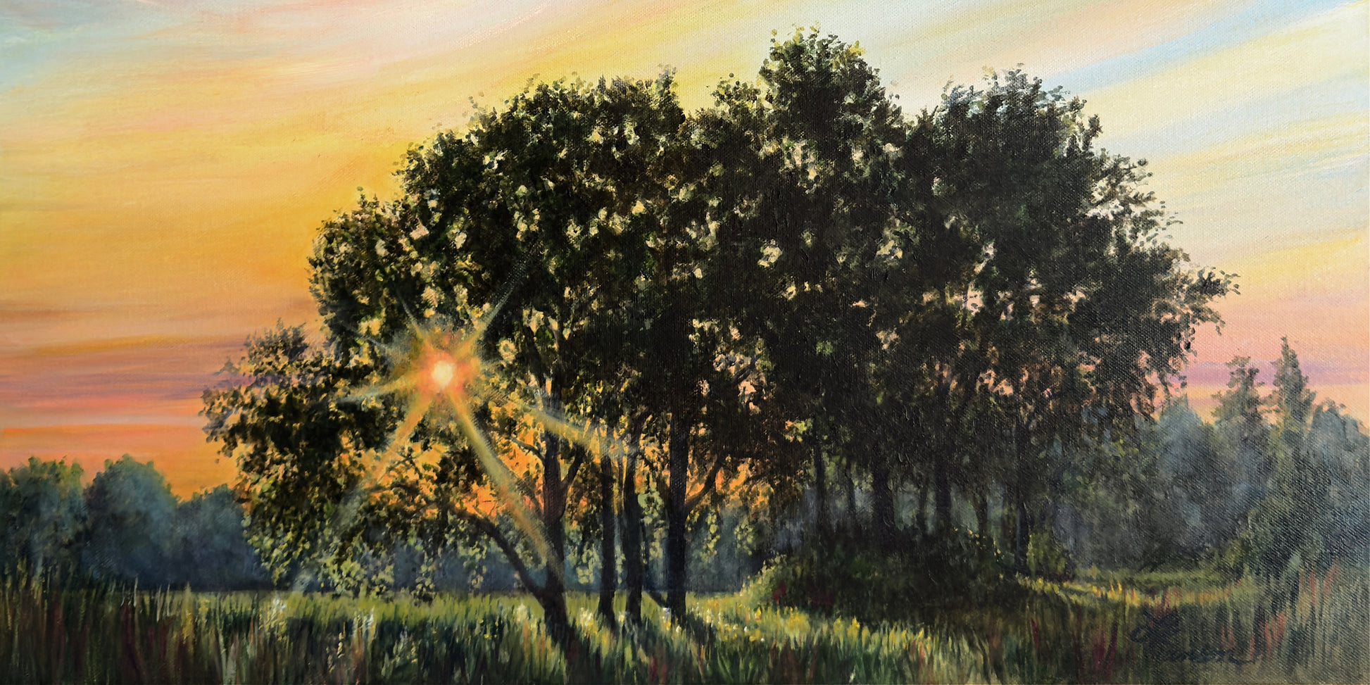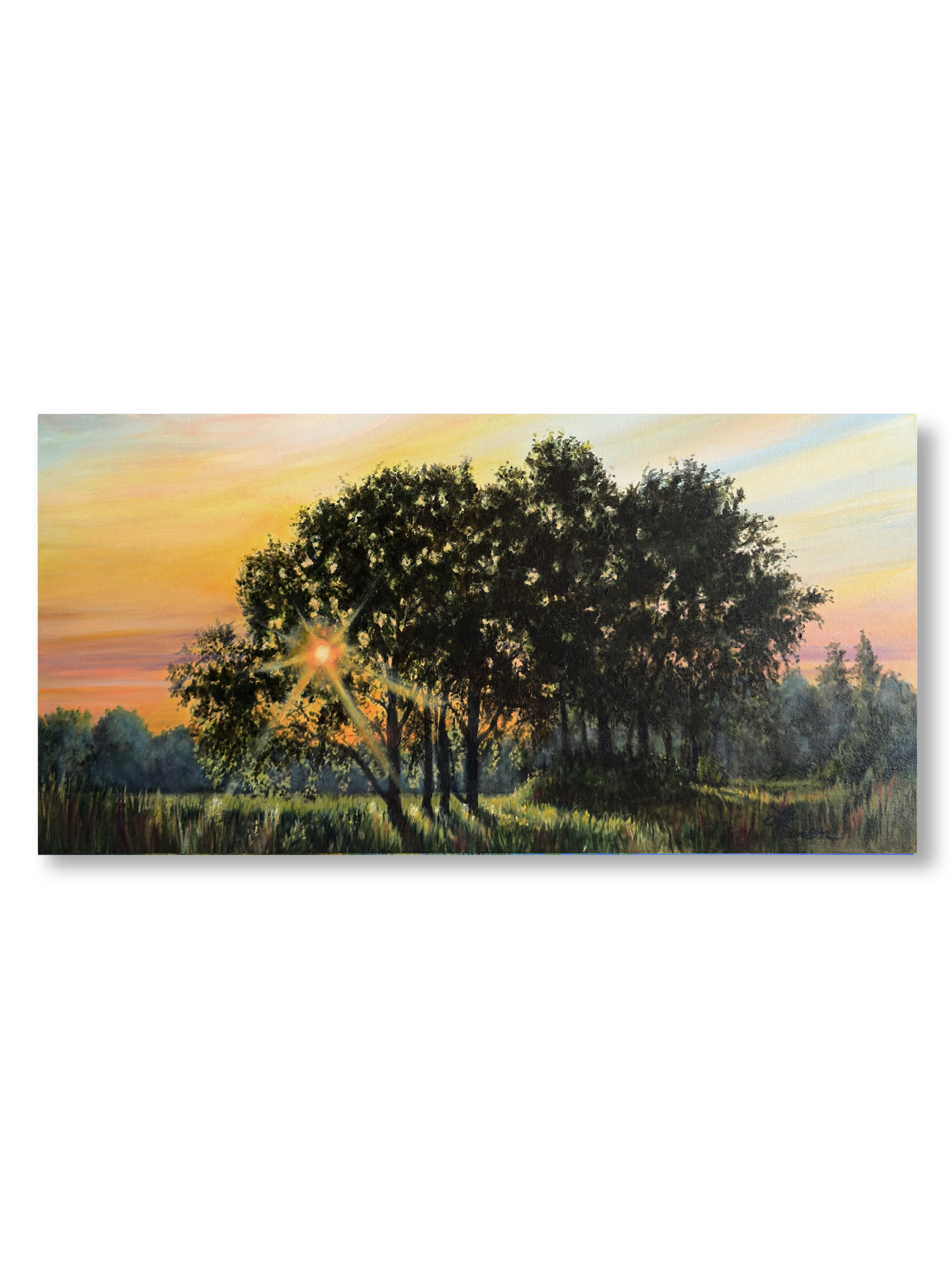 Some of my best painting inspirations are from driving in the car on country roads and even better when it is in the evening. This was witnessing such a lovely sunset with big tall wispy clouds capturing the colors and light of the sun.