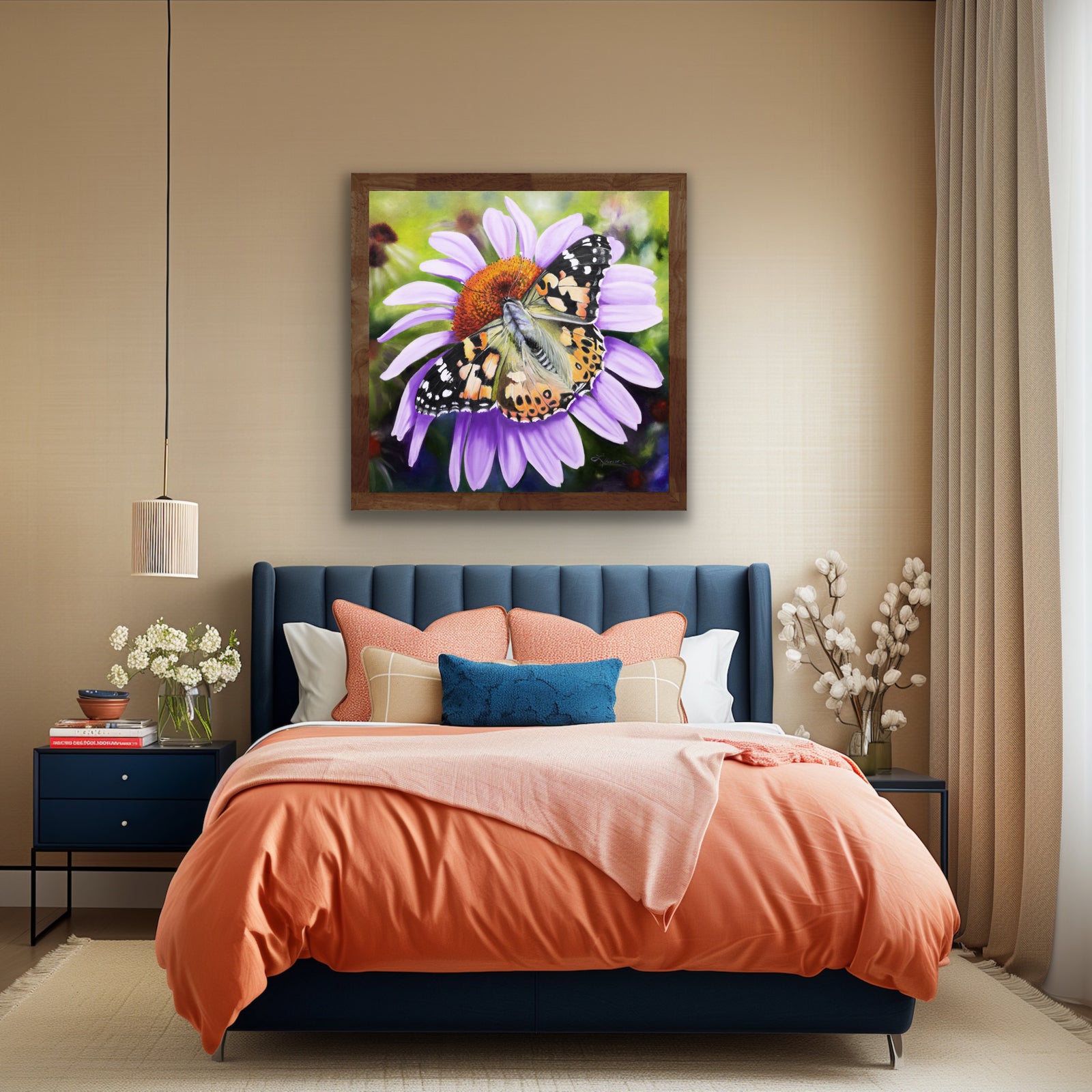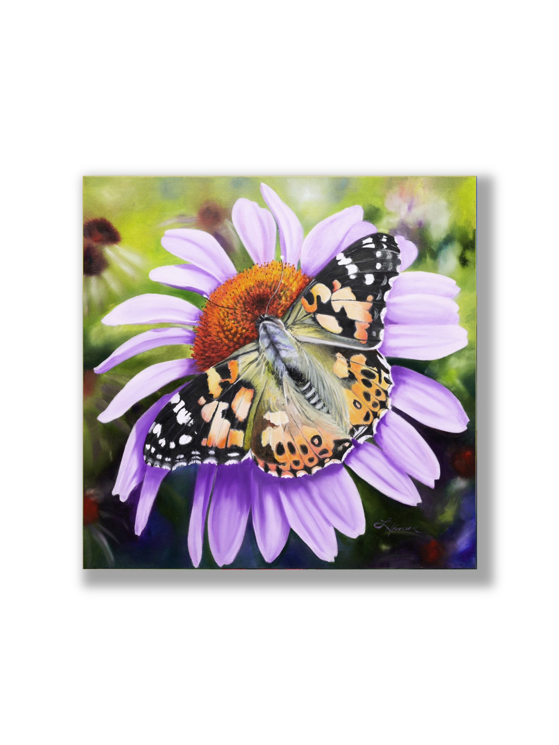 I love butterflies! They remind me of fling flowers. I painted a collection of 5 butterflies and flowers from my photos. Some paintings are referenced from separate photos of a butterflies and different flowers, then, composed together on canvas. This is Painted Lady butterfly I composed together on a cone flower.