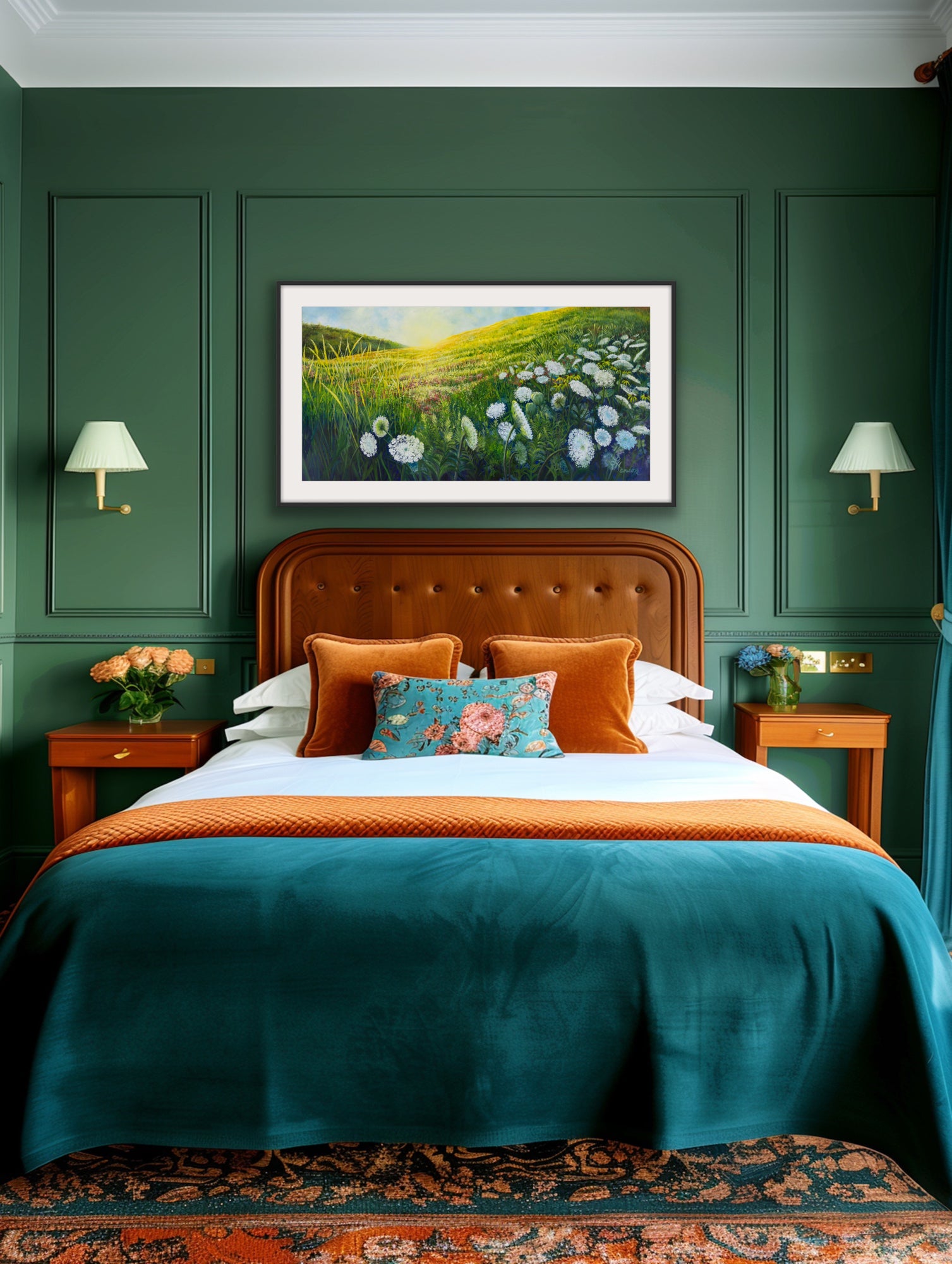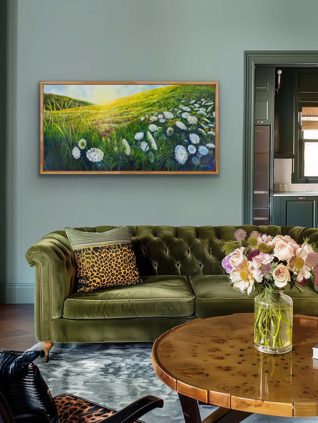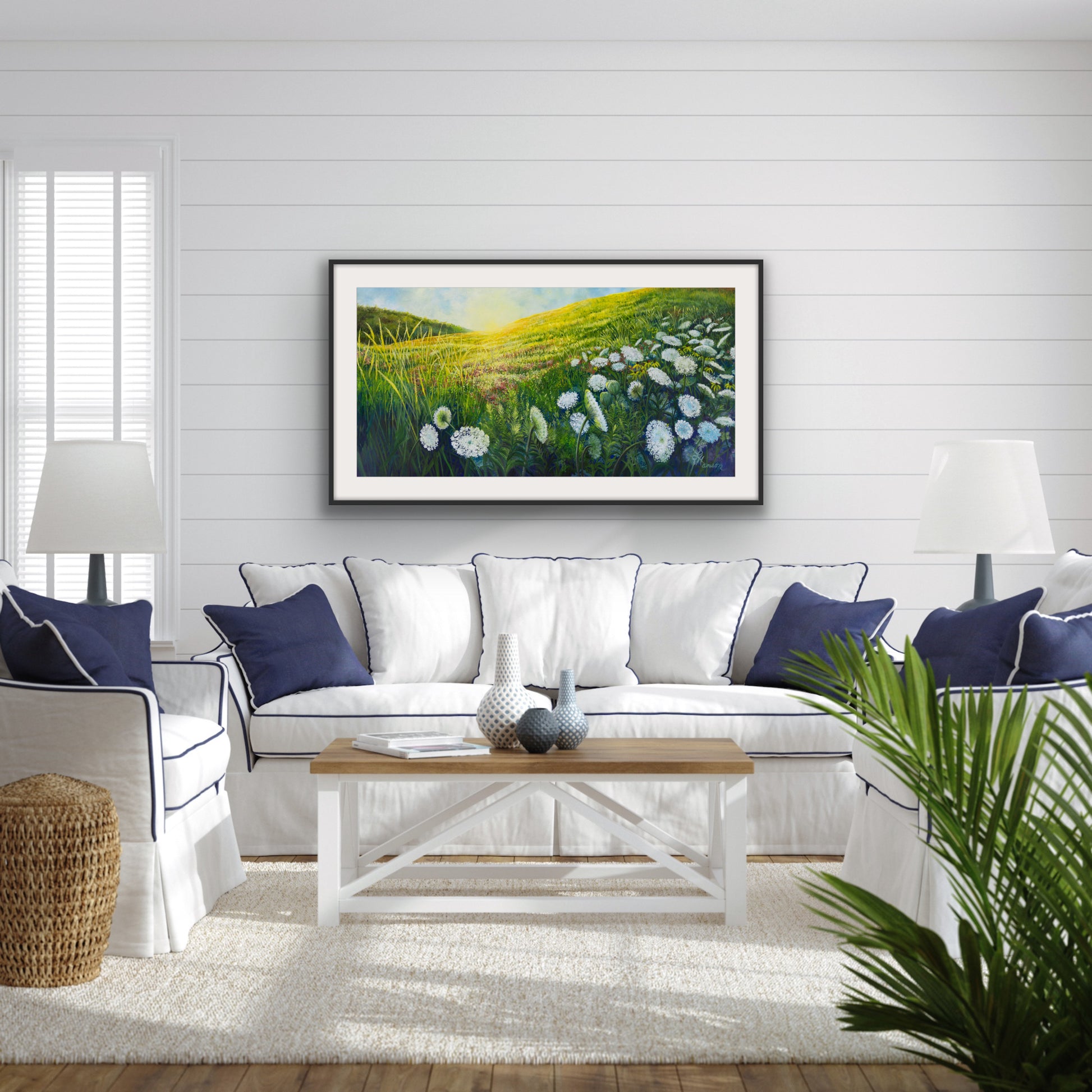 This oil painting is a celebration of the rolling hills and prairie flowers of central Minnesota. The golden sun rises over the hill illuminating the Queen Ann's lace, yellow cone flowers and grasses drawing us in to the sweet smelling meadow with cool feet and warm face.