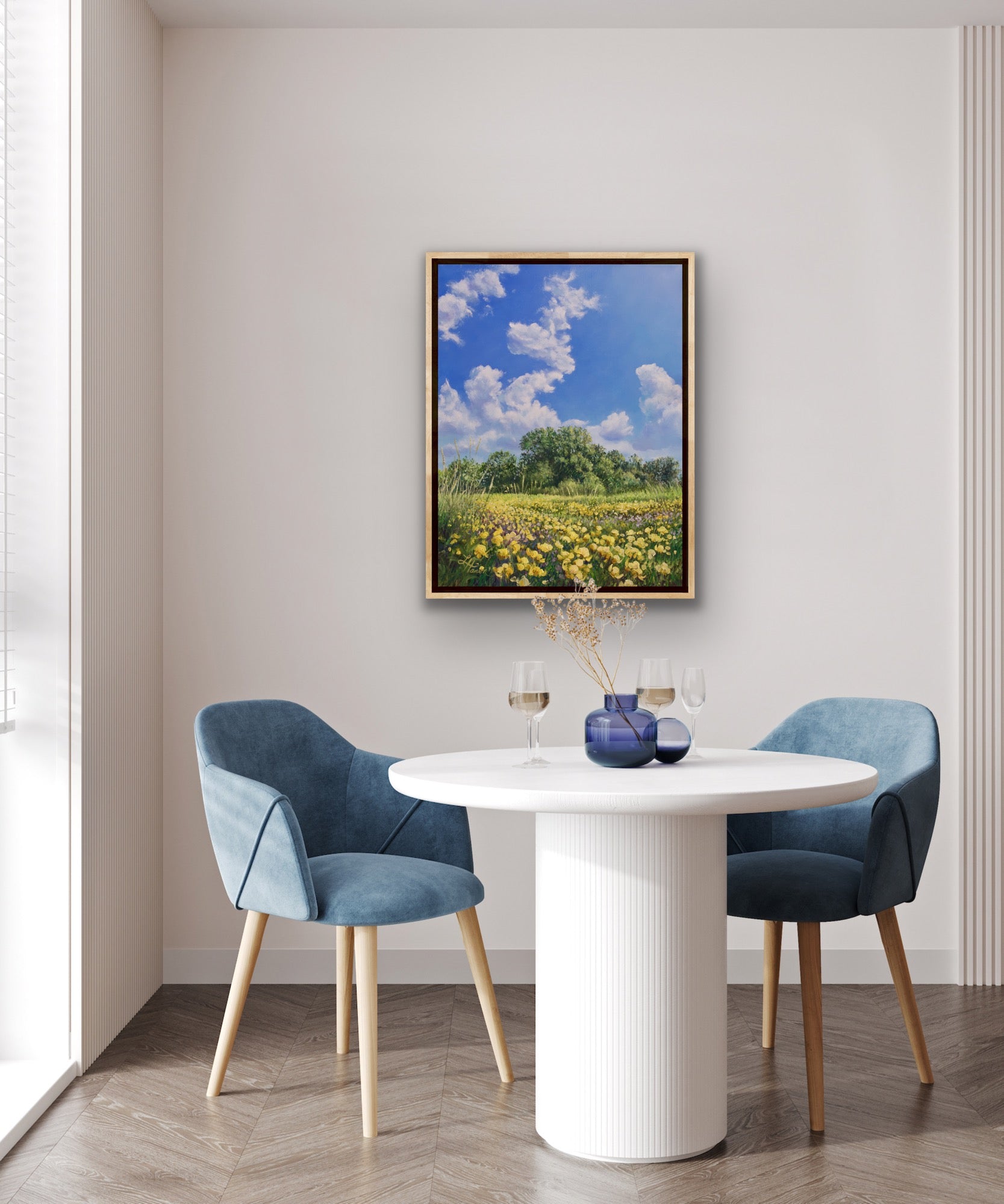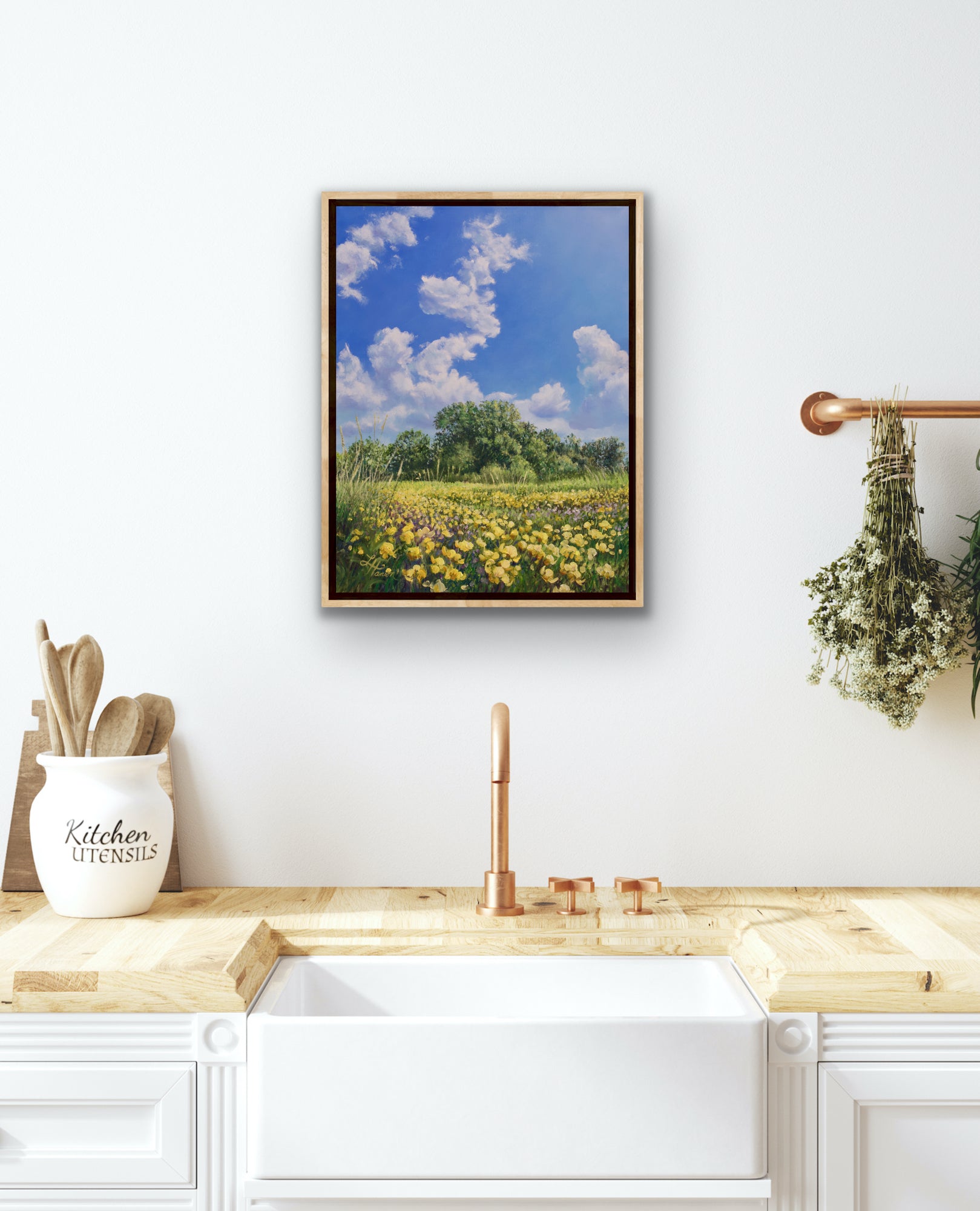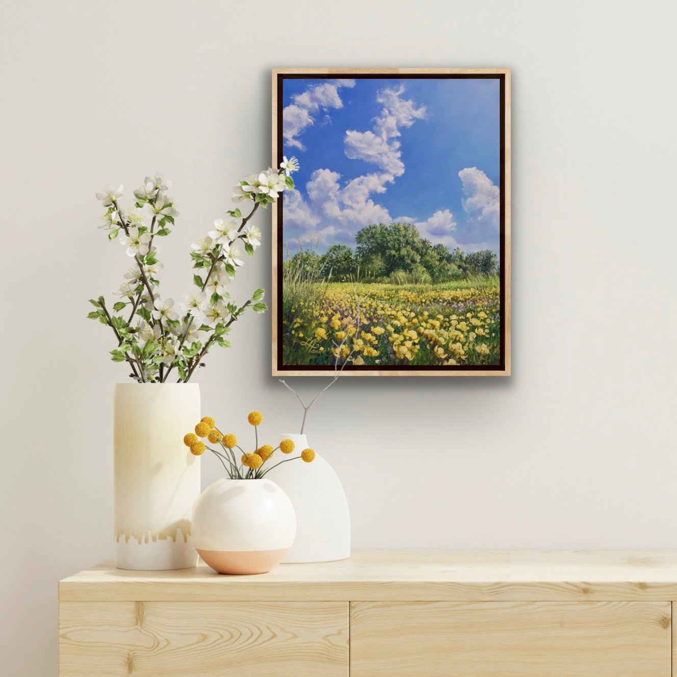 It's that feeling of summer freedom with the warm sun and running through the open flower fields looking at the shapes in the clouds. The flowers, called Bird's Foot. They form a cheery bright yellow blanket across the field the bright blue and white clouded sky.